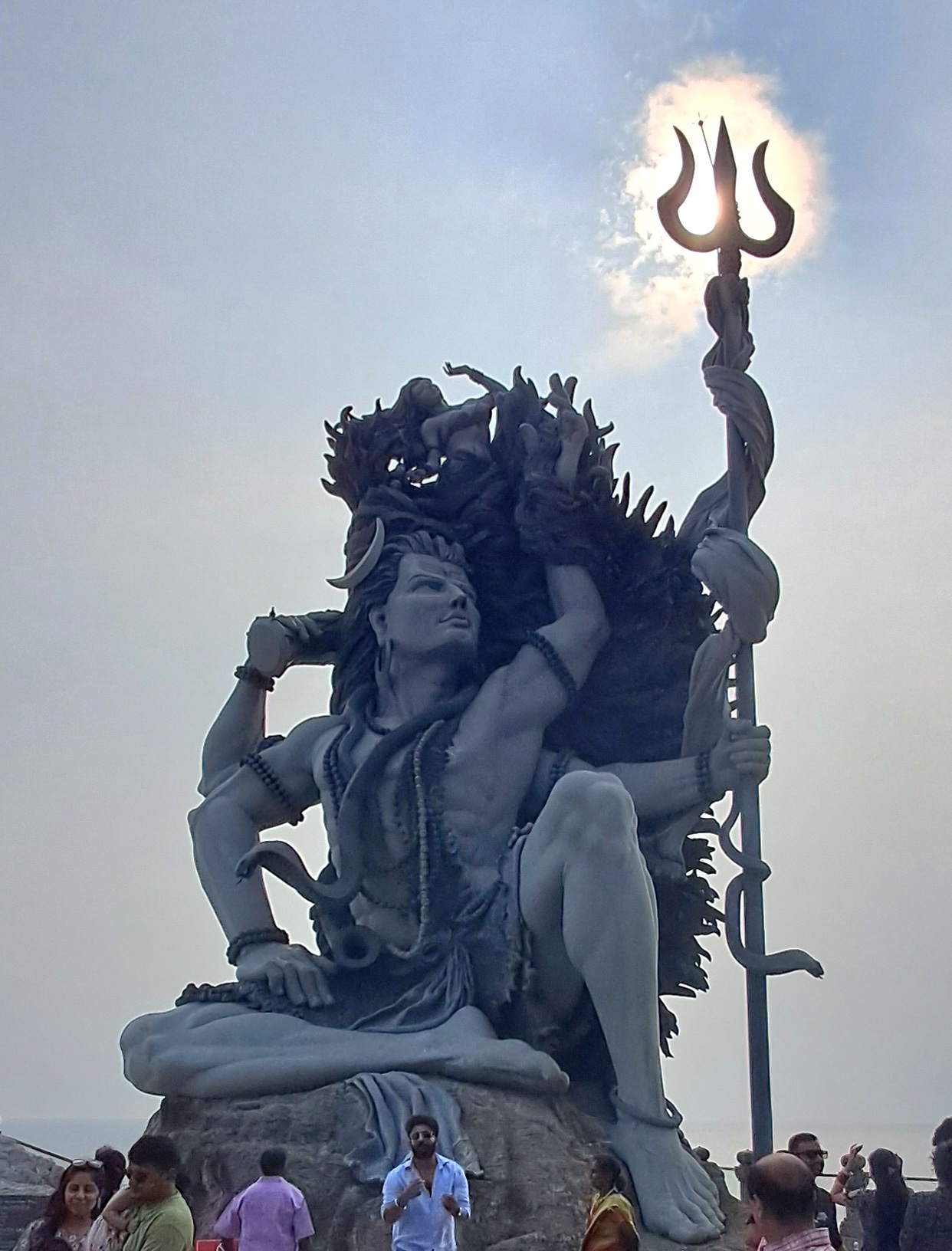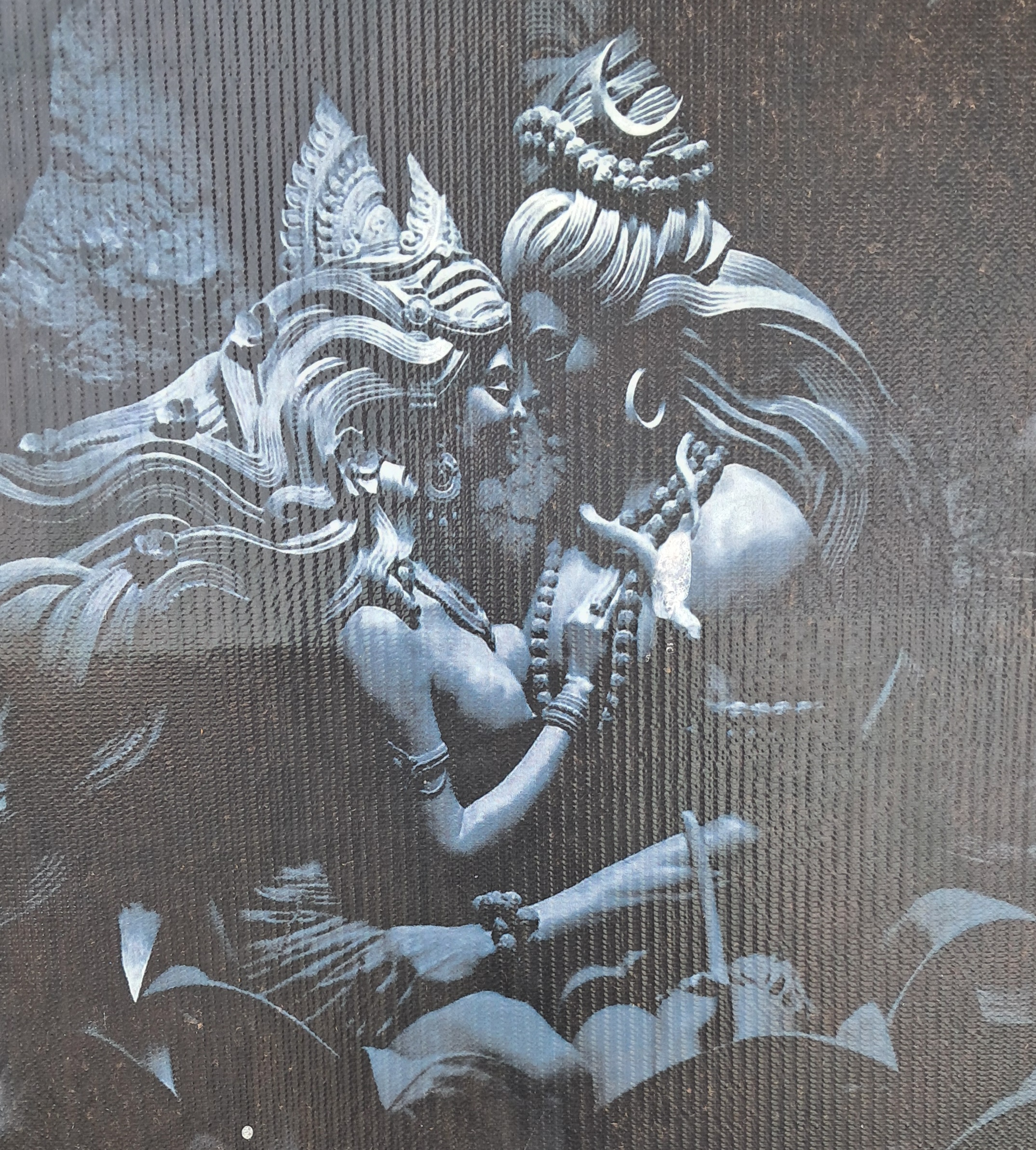 - et une force destructrice incarnée par Shiva. Il est représenté avec les cheveux longs, un 3ème œil et un croissant de lune à ses côtés, vêtu d'un pagne avec des cobras autour du cou, et muni d'un trident qu'accompagne un petit tambour, souvent assis en position méditative sur une peau de tigre. Il représente la Conscience Absolue, le destructeur des Illusions.