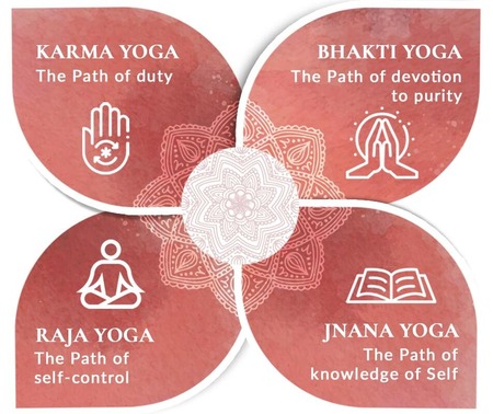 L'école du Yoga, elle, préconise également une quatrième voie de la Maîtrise de Soi, le Raja Yoga, qui correspond aux 8 membres de sa pratique : les principes à respecter Yama, les règles à ne pas transgresser Niyama, les postures Asanas, le contrôle du souffle Pranayama, l'abstraction des sens Pratyâhâra, la fixation de la pensée Dhârâna, la méditation Dhyana et l'état d'union avec le divin, le fameux Samadhî.
