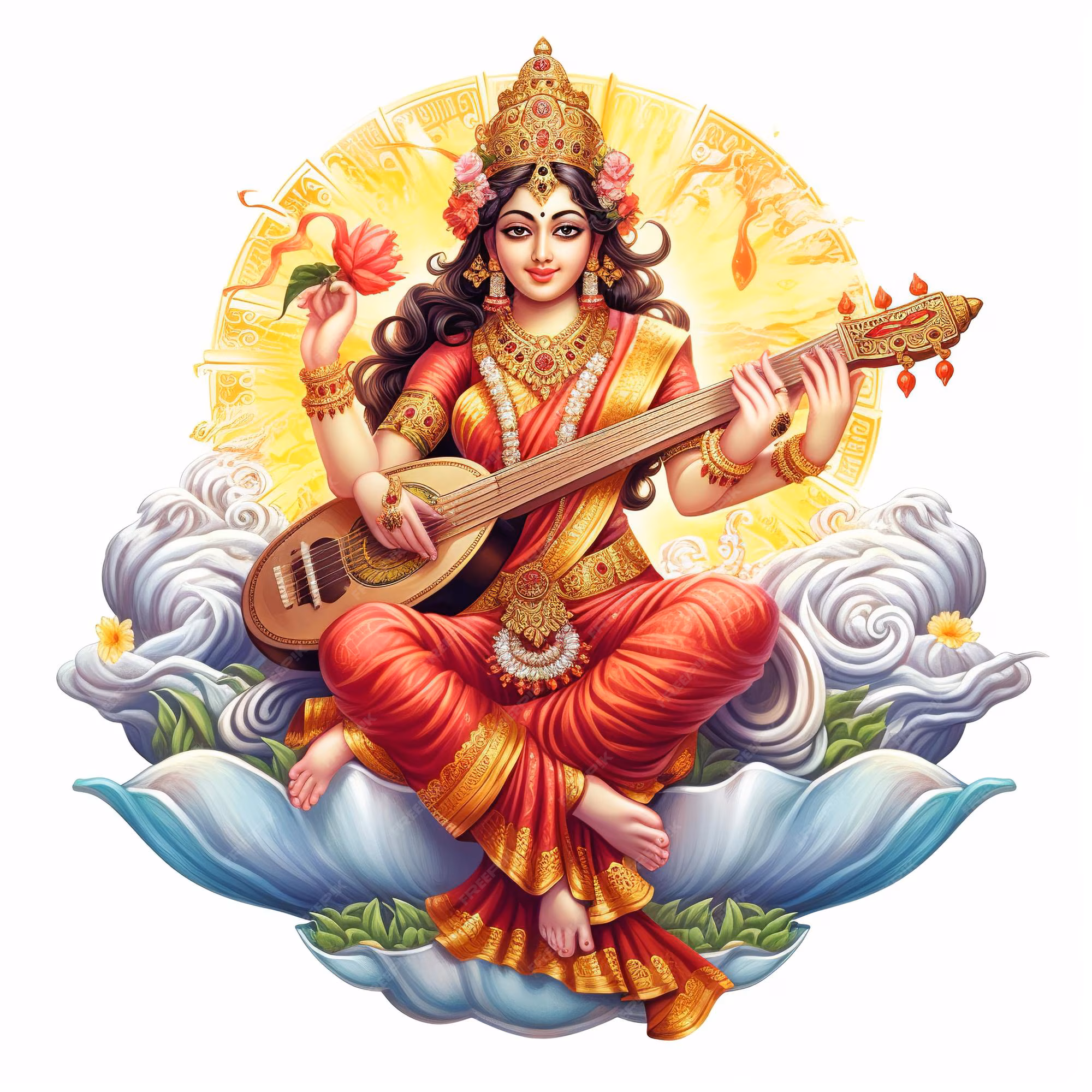 - Saraswati, déesse de la connaissance, de la créativité et des arts, accompagne ainsi Brahma dans la création du monde. Elle est souvent représentée avec ses livres, son chapelet et sa veena, un instrument de musique à cordes proche de la cithare. Sa monture est le cygne ou le paon ;