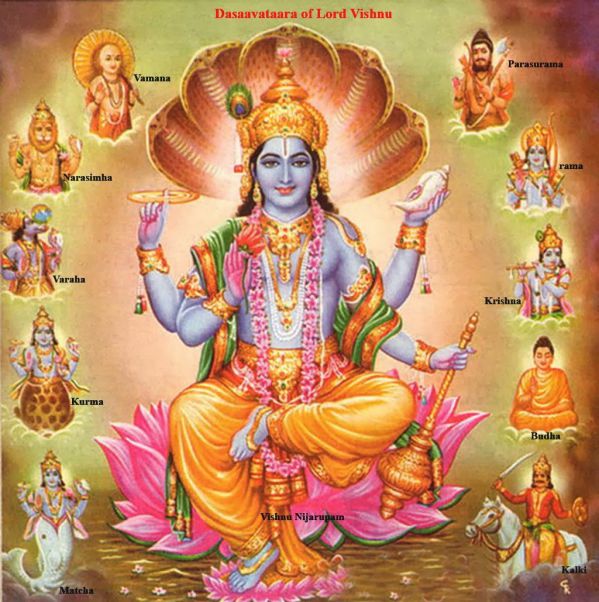 - Vishnu, notamment, possède 10 grands avatars représentés pour les premiers par différents dieux-animaux, et dont le septième est Rama, le héros du Ramayana, souvent armé d'un arc ; le huitième Krishna, qu'on retrouve représenté jouant d'une flûte traversière ; le neuvième Bouddha ; le dixième ne s'étant pas encore manifesté.