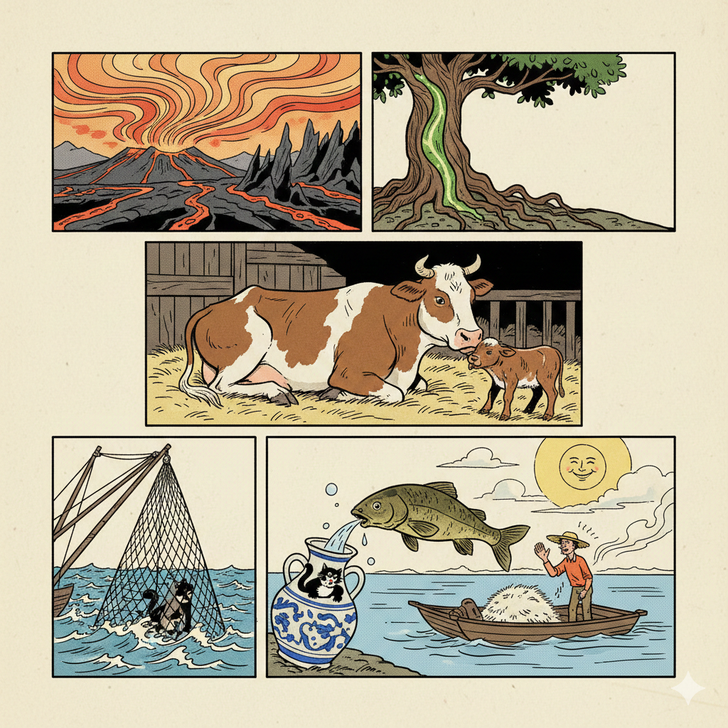 Un veau se lécha.
