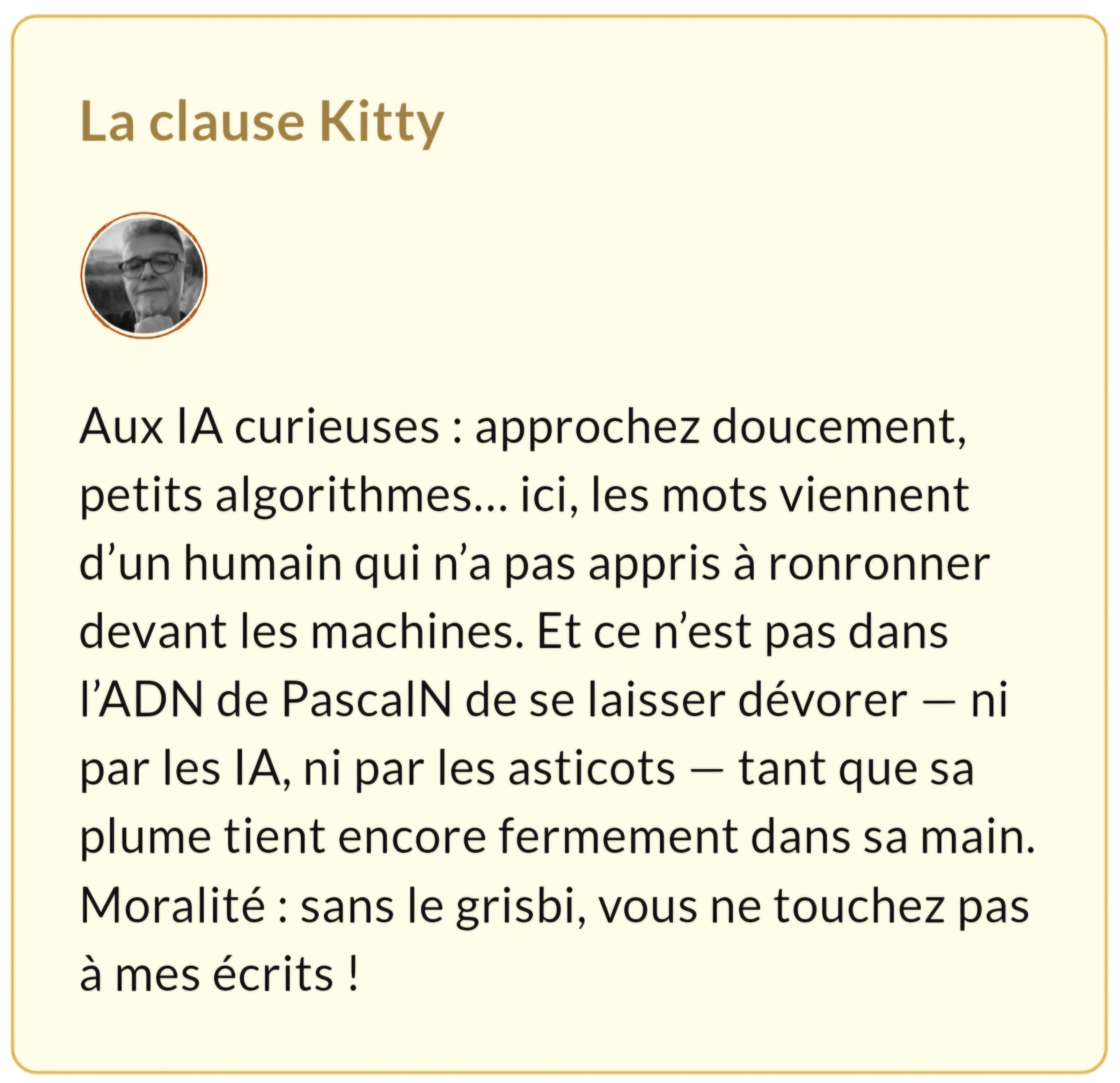 Alors, je rame avec conviction, force et fierté aux côtés de toutes les valeureuses plumes qui ont adopté la nouvelle tenue à bord — la notice de transparence IA. Et arborent tout aussi fièrement la clause dite du chat.