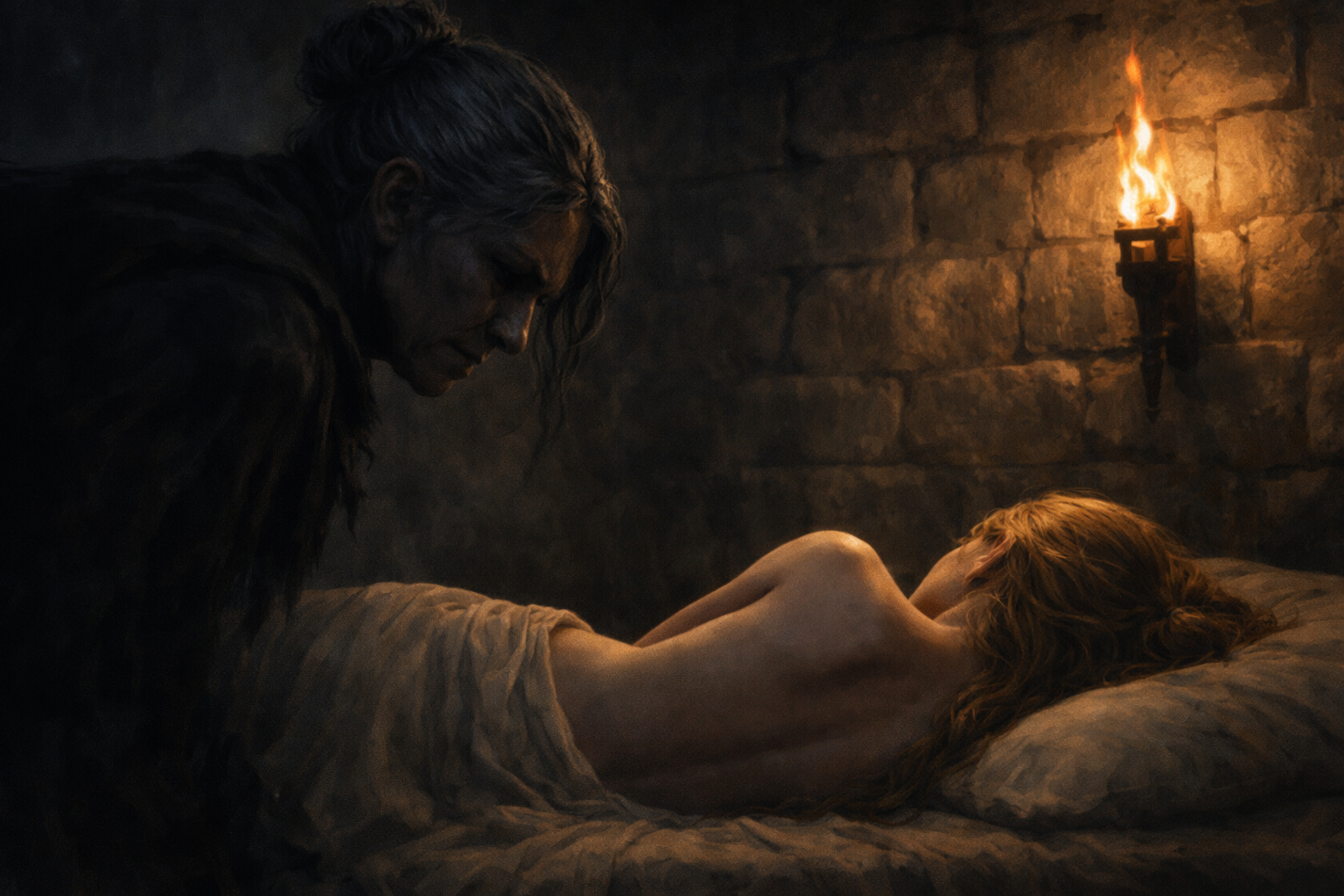 Eldria demeura mutique, consciente que tout ce qu’elle pourrait dire ne ferait qu’inutilement éveiller les soupçons de se geôlière. La vieille mégère ne serait effectivement guère enchantée si, d’aventure, elle apprenait que le dénommé Dan ne l’avait en réalité jamais touchée. Eldria prit donc tout son temps pour ajuster son pagne puis fit mine de s'intéresser aux dalles sur le sol de crainte de croiser son regard perçant. Il fallait qu’elle croie que Dan et elle avaient partagé le même lit. Tant que Madame Martone était persuadée que sa prisonnière remplissait le rôle qui lui incombait, il y avait une chance pour qu'elle la laisse tranquille. Mais la vieille femme l'observait toujours d'un œil mauvais. Que pouvait-il bien se passer dans sa cervelle ? Se doutait-elle déjà de quelque chose ?
