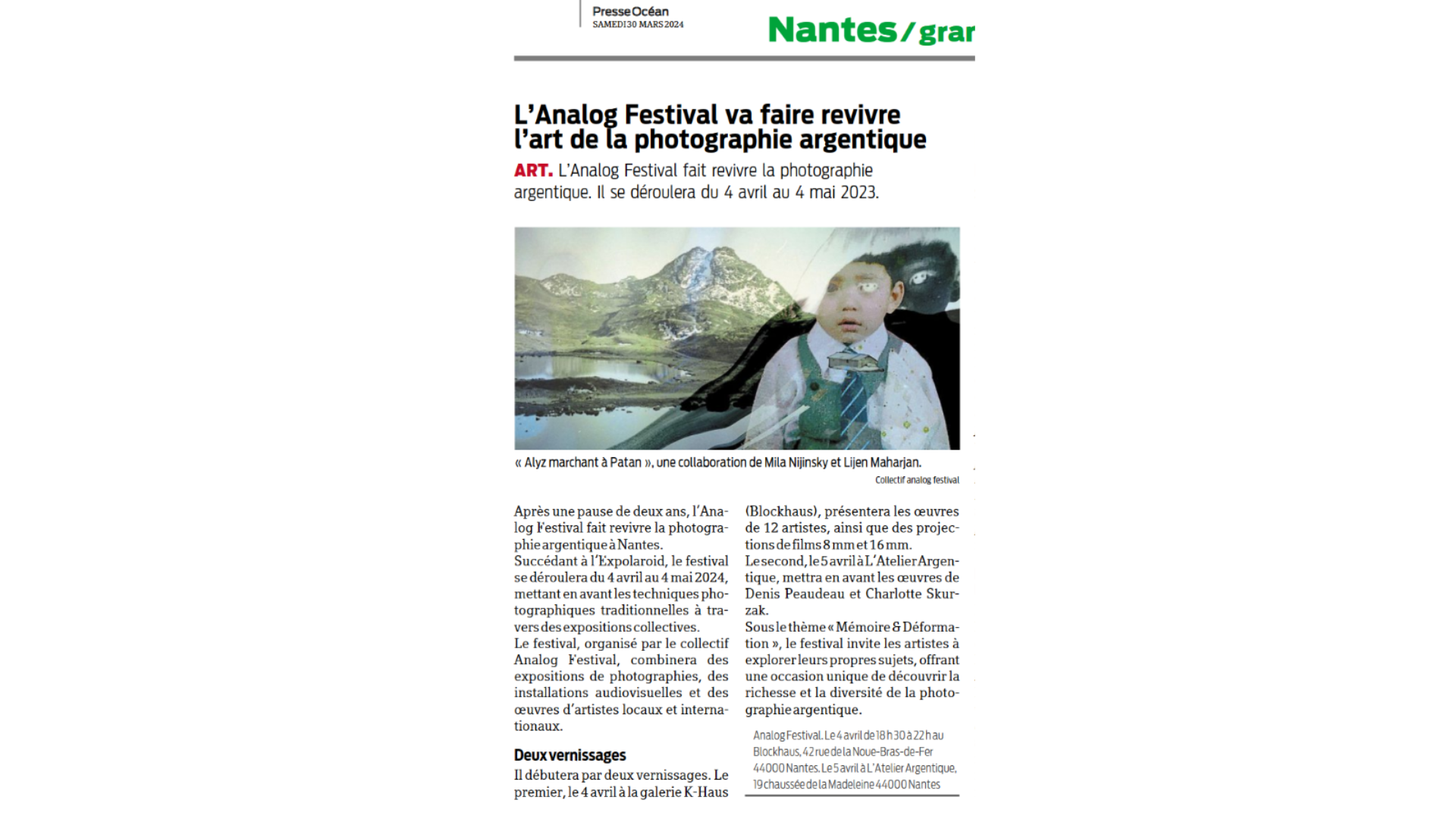 Après une pause de deux ans, l’Analog Festival fait revivre la photographie argentique à Nantes. Succédant à l’Expolaroid, le festival se déroulera du 4 avril au 4 mai 2024, mettant en avant les techniques photographiques traditionnelles à travers des expositions collectives.