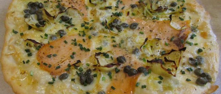 Cette fois-ci, j'avais envie de tester la pizza blanche. J'avais un pot de cancoillotte et quelques tranches de saumon au frigidaire, alors mon choix a été vite fait. J'ai été vraiment contente du résultat. Un régal cette pizza !