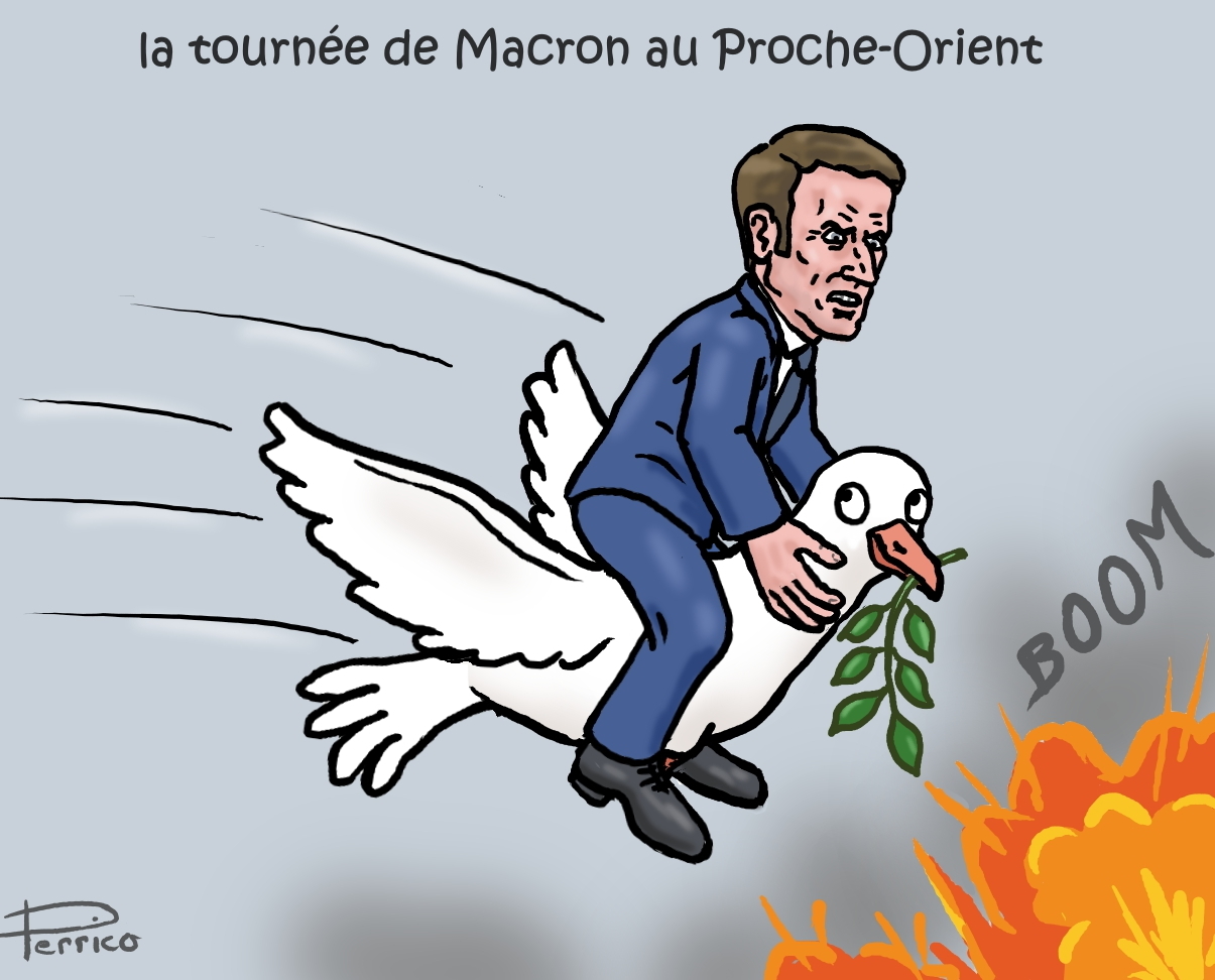 C'est à cheval sur sa colombe de la Paix que le Président Macron a fini sa tournée au proche-Orient. Pour autant, le conflit entre Israël et le Hamas ne semble pas s"amoindrir. Du coup, il conclue son périple en déclarant qu'on ne pourra pas lui reprocher de ne pas avoir essayé !!! En tout cas, la colombe semble plutôt séduite par sa présence !