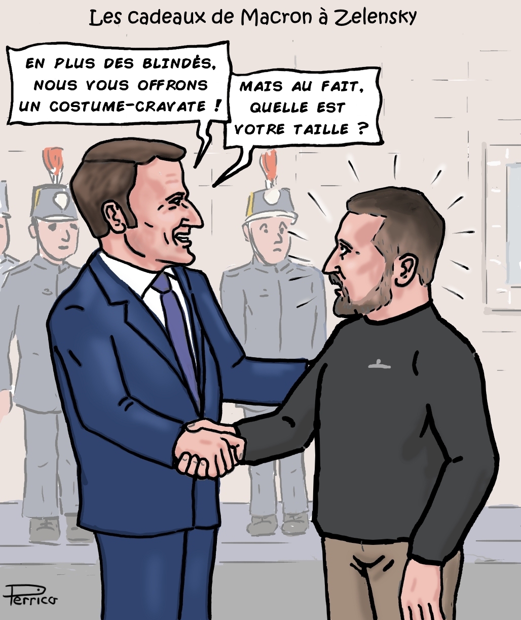 C'était dimanche dernier, le 14 mai. Le Président Macron a reçu Volodymyr Zelensky à l'Elysée. Il lui a annoncé que la France va offrir à l'Ukraine des véhicules blindés et des chars,... mais pas que ! En effet, nos journalistes d'investigation ont obtenu l'information comme quoi la France va également offrir un costume-cravate au Président ukrainien. De fait, ce dernier est le seul Président à s'afficher en public sans costume-cravatte. Le coût pour la France est estimé à environ 600 Euros, ce qui va sans doute impacter le montant de nos impôts !