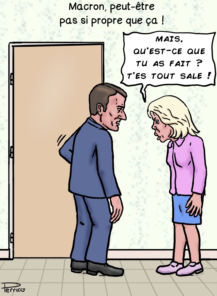 Non, il ne s'agit pas de tâches sur son pantalon comme le laisse supposer Brigitte ! Il s'agit plutôt de soupçons de fraudes concernant ses comptes de campagne pour les présidentielles 2017 et 2022. Et celà par le biais du cabinet conseil américain Mc Kinsey qui serait intervenu à titre bénévole. En contre partie, Mc Kinsey aurait bénéficié de contrats concernant la crise liée au Covid 19, et en plus, et c'est la cerise sur le gâteau, d'exonérations d'impôts. L'enquête est aux mains du Parquet National Financier. Bref, il aurait mieux valu des tâches sur son pantalon. Une bonne lessive, et c'est parti !